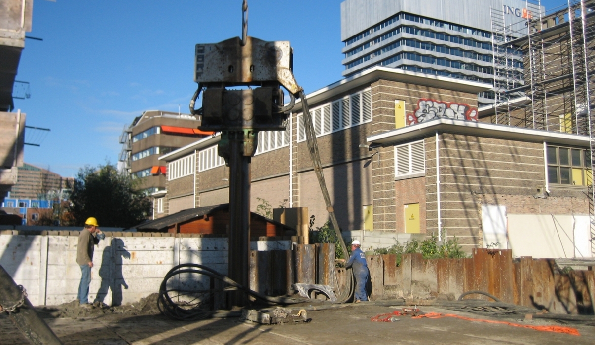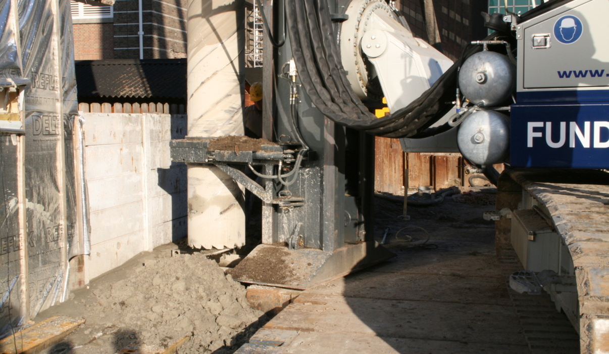Omdat het ging om een fundering tegen een bestaande bebouwing aan, kozen wij voor wanden van gestorte betonpalen tegen elkaar, een zgn. boorpalenwand. Op deze manier kon de fundering trillingsvrij worden aangelegd.