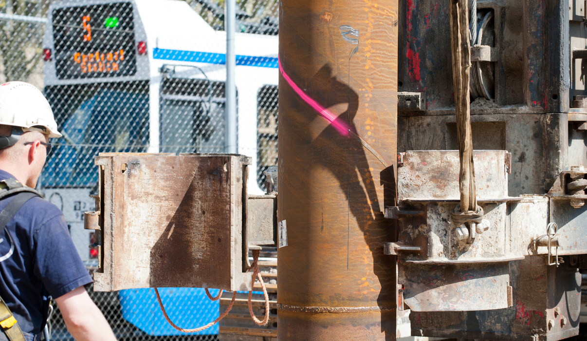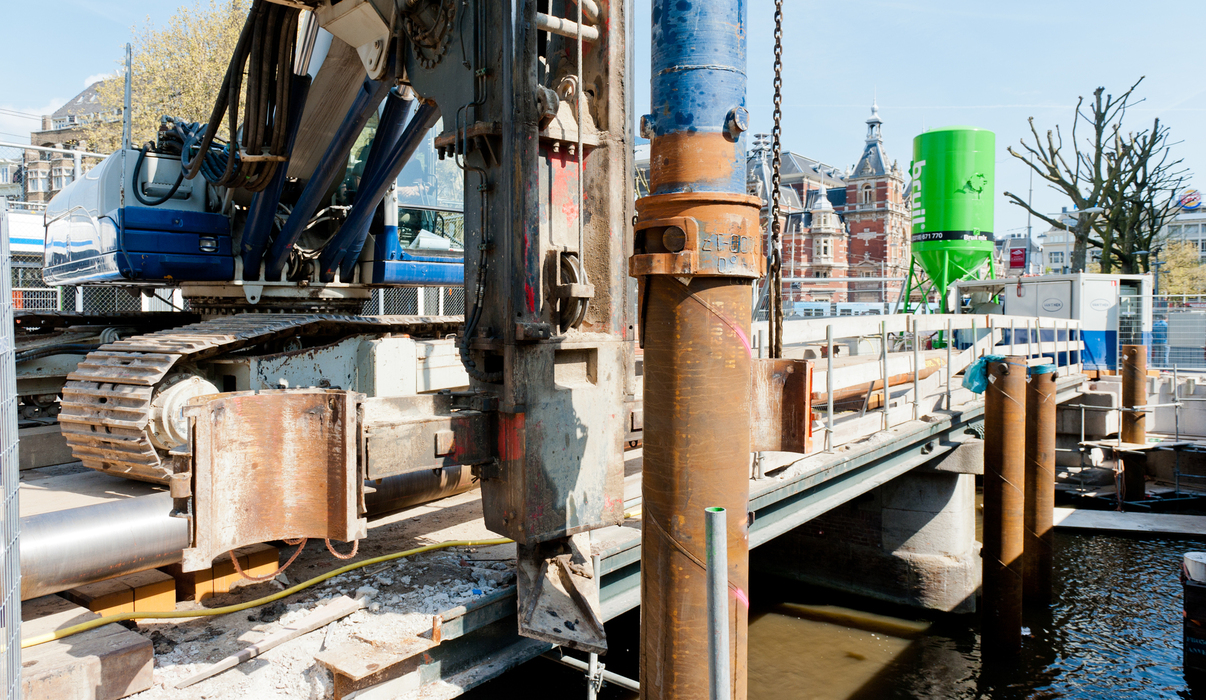 Eerst zijn HEK-buispalen ingeschroefd om een opvangconstructie te kunnen plaatsen, waarbij een gedeelte van de oude houten fundering is gecrushed.