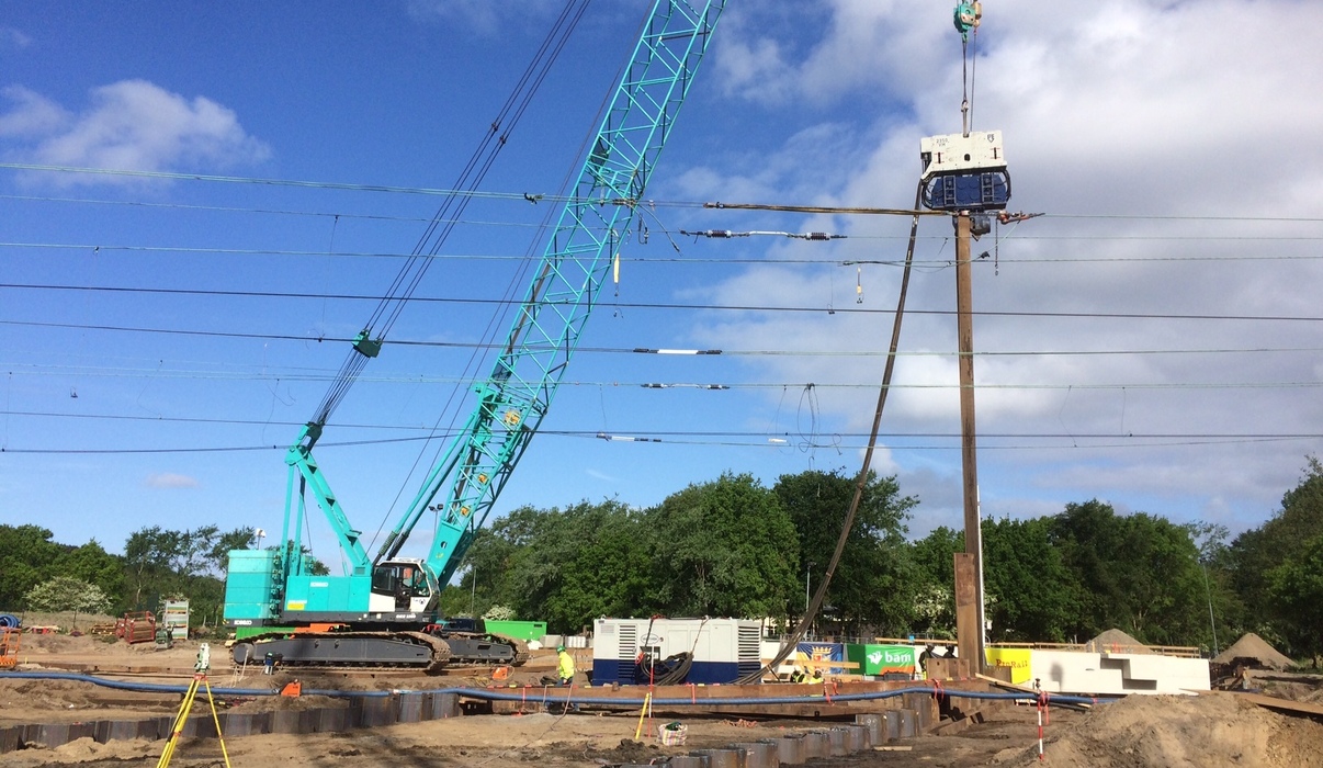 In een buitendienststelling zijn door ons 2 schermen van ca 50 meter damwand AZ 36-700N, lang 19,5 meter, door het spoor gezet. Dit alles in een tijdsbestek van 24 uur.