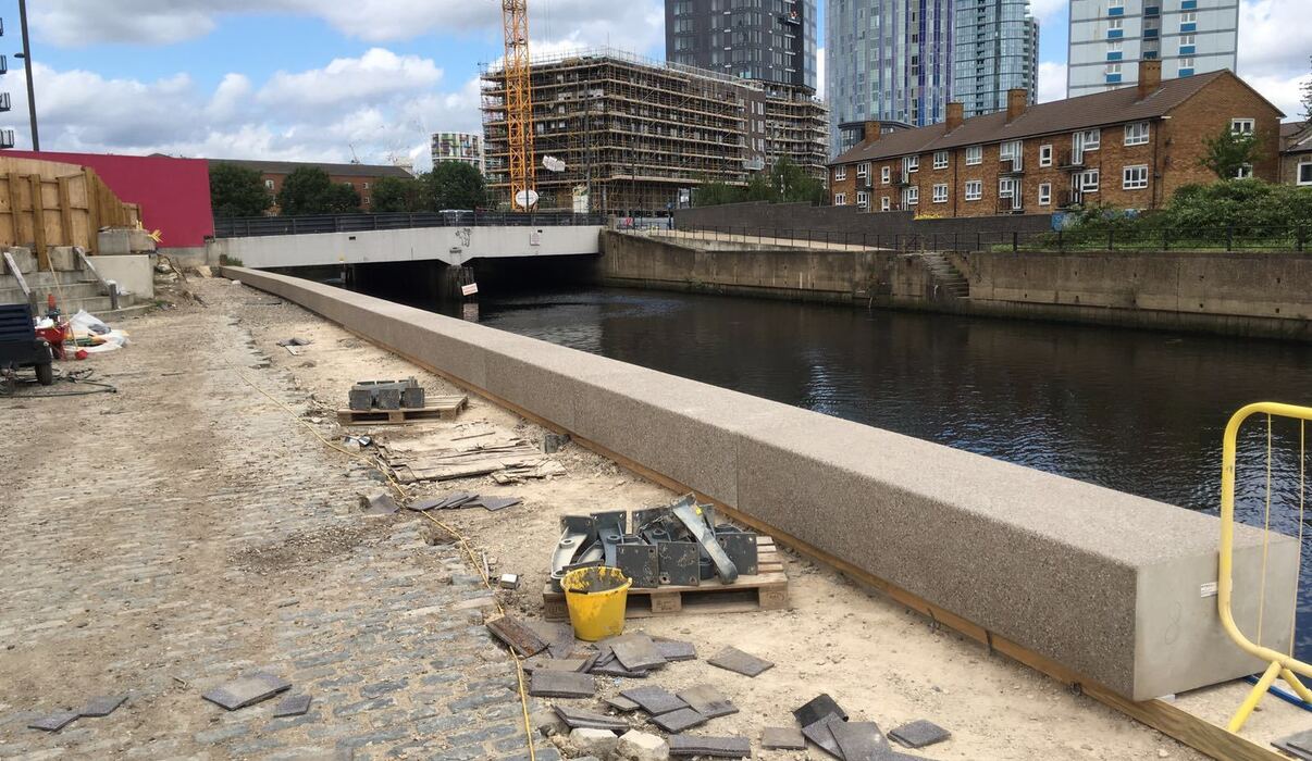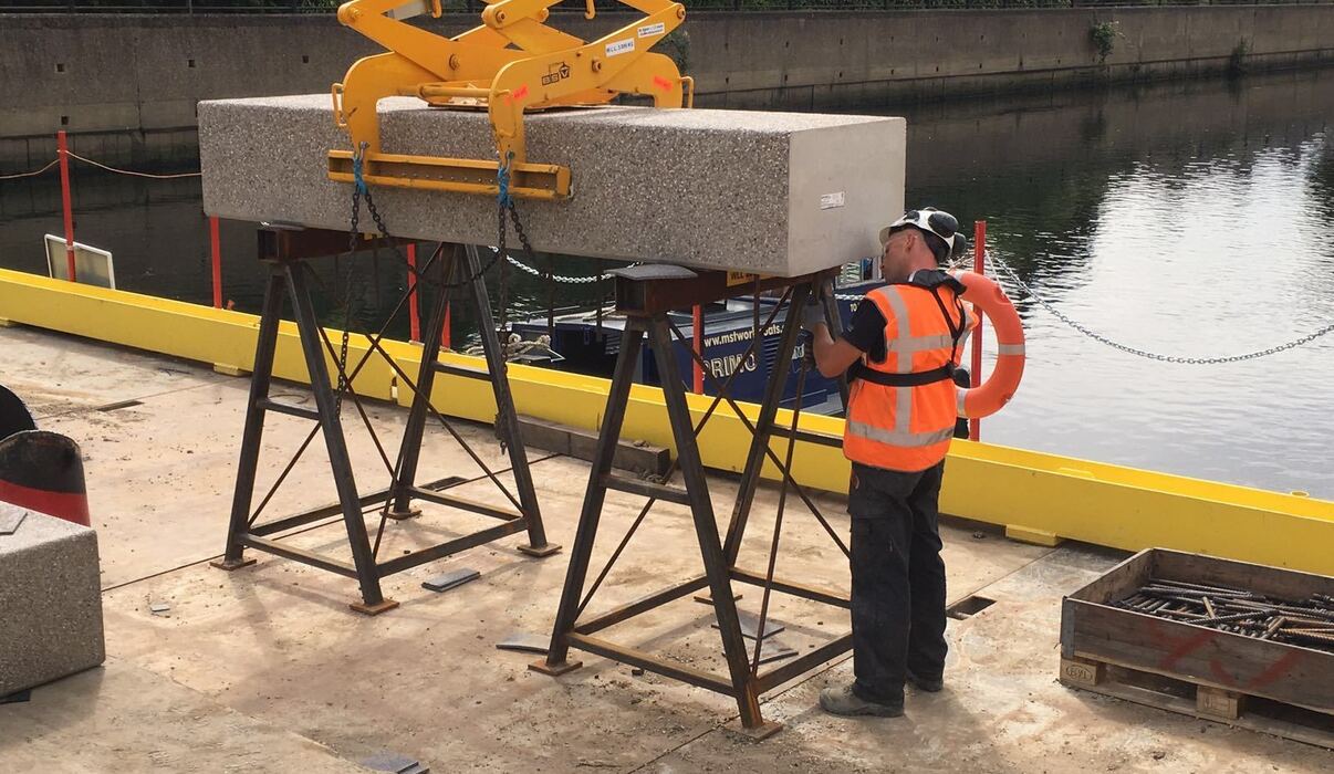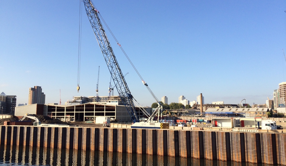 In Londen installeert Van ’t Hek stalen damwanden zowel vanaf het land als op pontons vanaf het water, voor een zgn. River Wall van ruim 1 kilometer lang.