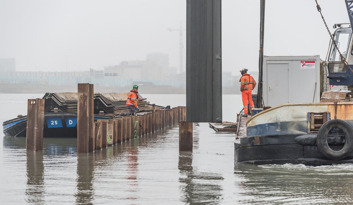 Ook wordt een complete damwandkuip geïnstalleerd, Met daaromheen nòg een damwandkuip, om hier later een bouwweg en werk-/ketenparkterrein op te kunnen bouwen.