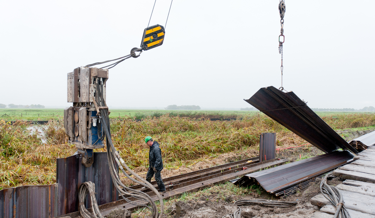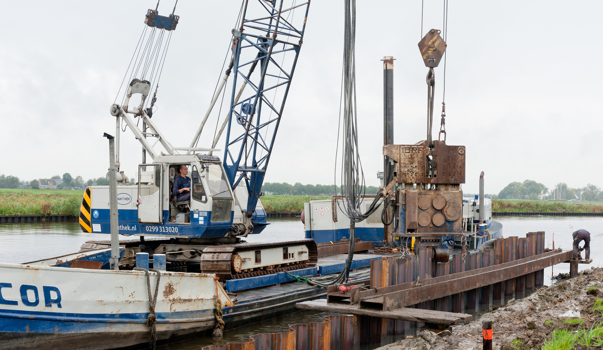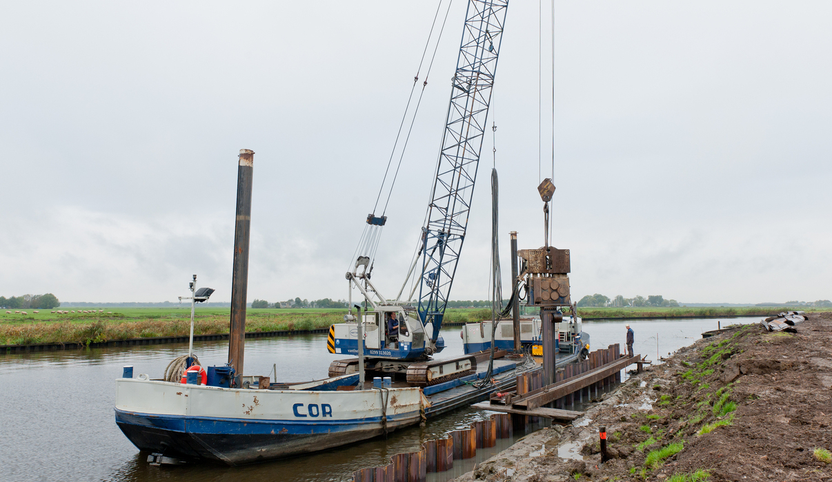 Deze damwand wordt door Gebr. van ’t Hek vanaf het land en vanaf ons werkschip De Cor in het water aangebracht.